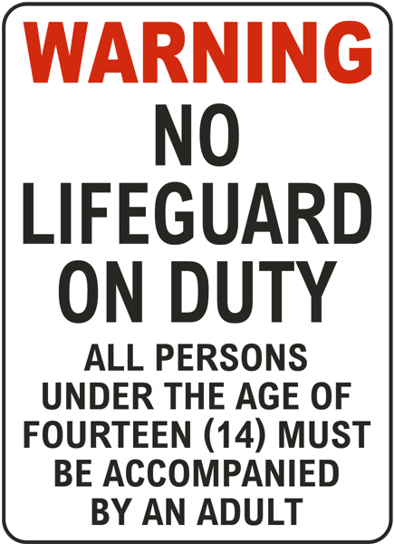 10.8.g. If the facility employs no lifeguards, the management shall post a sign in a prominent location near the recreational water facility stating "Warning: No lifeguard on duty - All persons under the age of fourteen (14) must be accompanied by an adult".