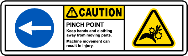 A Caution Pinch Point Left Arrow Label warns workers to keep hands and clothing away from moving parts, when machine is in movement to avoid a pinch point injury. This Label is a helpful tool for the protection of the health and safety of personnel when operating equipment. Apply this label to warn workers of pinch point hazards.