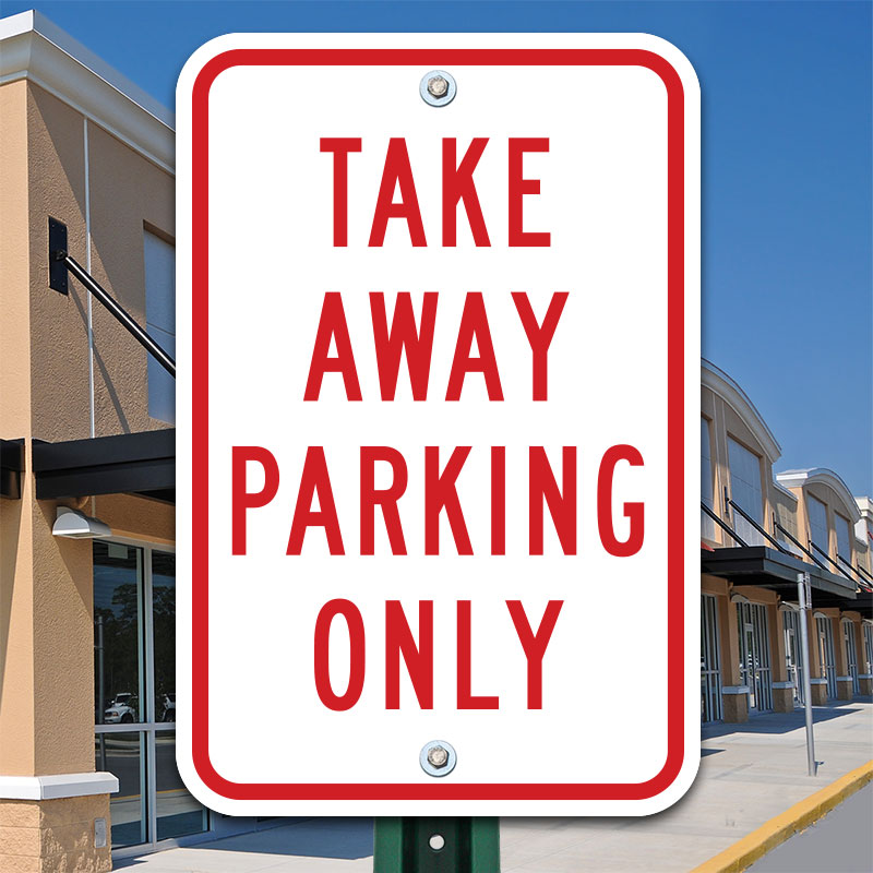 Take Away Parking Only Sign is the perfect option to designate a special parking space for your customers on the go. Whether your sign needs are temporary or permanent, we offer multiple options in terms of size, material and hole configuration. Post your Take Away Parking Only Sign to address your parking policy and traffic concerns.