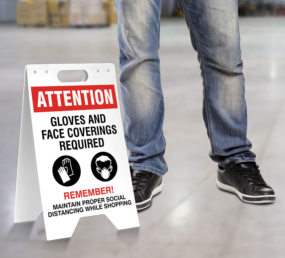 Attention Gloves and Face Covering Required Floor Stand is a great reminder that everyone needs to comply with new requirements by maintaining a 6 foot distance to protect themselves and others from the spread of illness. These stands are in stock at our facility in Garfield, New Jersey. Most orders ship either the same or next business day.