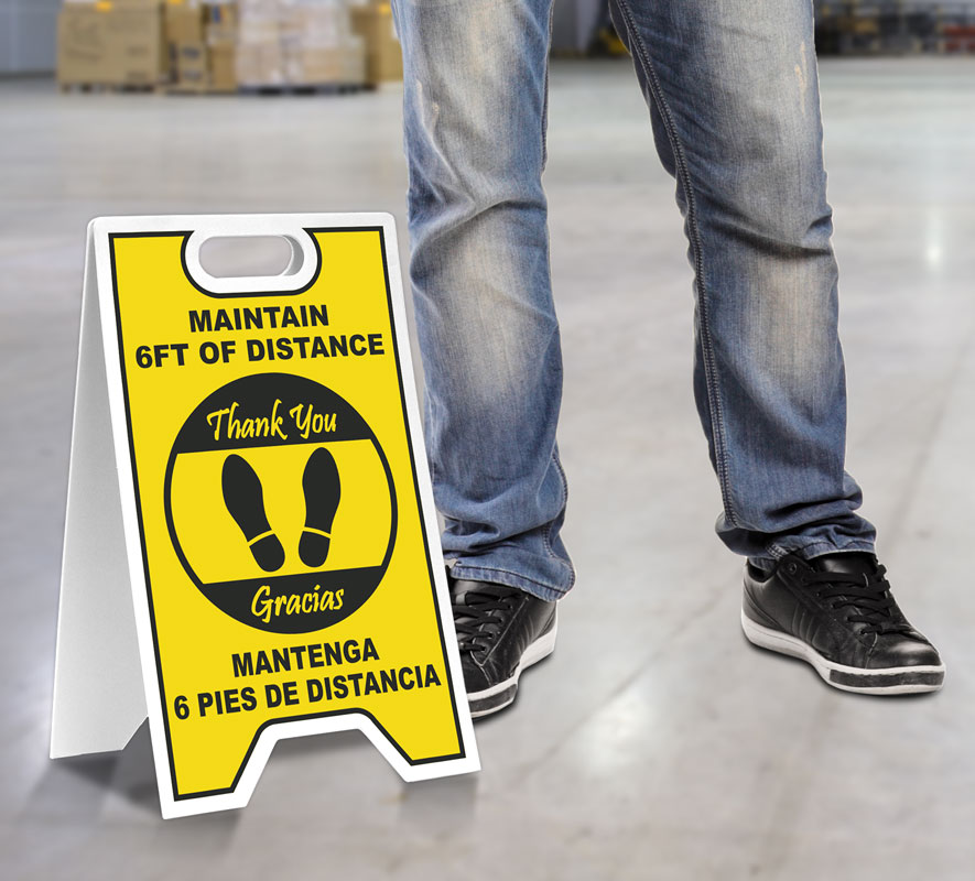 Bilingual Maintain 6 Feet Floor Stand is a great reminder that everyone needs to comply with new requirements in response of the COVID-19 outbreak to protect themselves and others from the spread of illness.