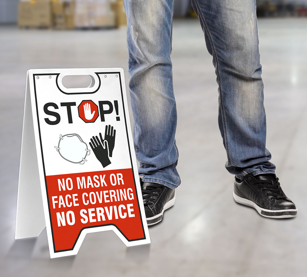 No Mask Or Face Covering No Service Floor Stand is a great reminder that everyone needs to comply with new requirements by maintaining a 6 foot distance to protect themselves and others from the spread of illness. These stands are in stock at our facility in Garfield, New Jersey. Most orders ship either the same or next business day.