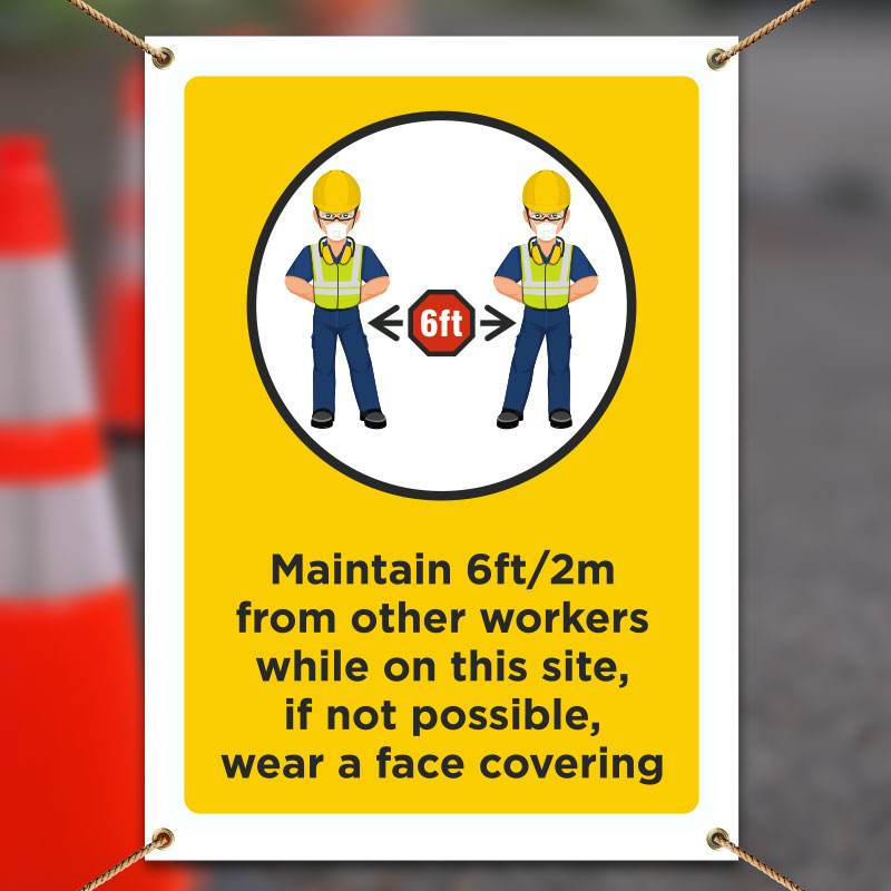 A Workers Maintain 6ft Banner is a great reminder that everyone needs to comply with new requirements by maintaining a 6 foot distance to protect themselves and others from the spread of illness.
