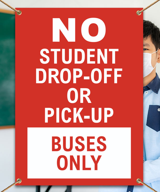 A No Student Drop-Off or Pick Up Buses Only Banner is a great reminder that everyone needs to comply with new requirements by maintaining a 6 foot distance to protect themselves and others from the spread of illness. Post this sign to communicate and reinforce appropriate safety and social distancing practices in your school.