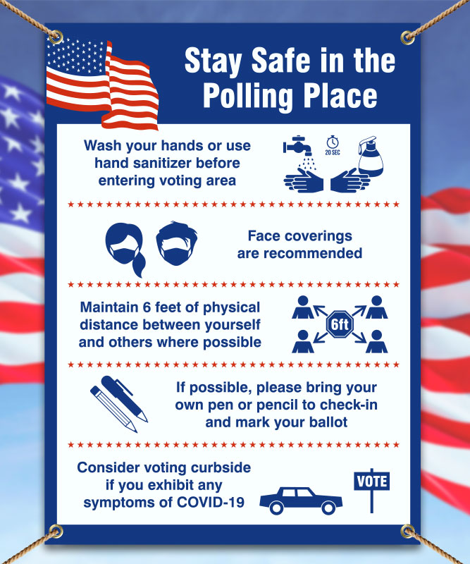Stay Safe In The Polling Place, Wash You Hands Or Use Hand Sanitizer Before Entering Voting Area, Face Coverings Are Recommended, Maintain 6 Feet Of Physical Distance Between Yourself And Others Where Possible, If Possible, Please Bring You Own Pen Or Pen