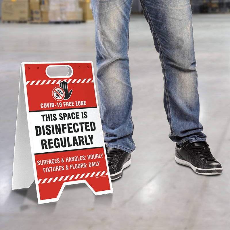 Use this This Space is Disinfected Regularly Floor Stand to inform the public of new regulations and a plan of action they should take in response of the COVID-19 outbreak. Business Owners should develop a comprehensive COVID-19 exposure control plan, which includes control measures, symptom checking, social distancing, hygiene and decontamination procedures, and training.