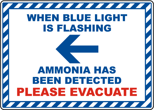 This When Blue Light Is Flashing Ammonia Detected Left Arrow Sign ensures worker safety by providing proper safety and hazard identification of ammonia gas, anhydrous ammonia, or liquid ammonia. This When Blue Light Is Flashing Ammonia Detected Left Arrow Sign is designed to provide a clear hazard warning for employees in food processing plants, manufacturing plants, and cold storage facilities. Signs can help identify ammonia refrigeration systems, containers, storage locations and other areas where ammonia is in use.