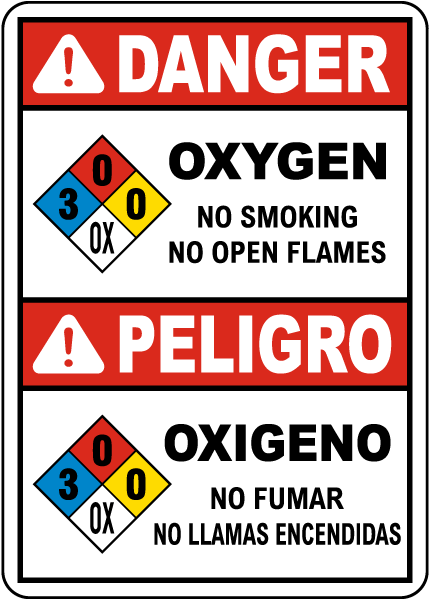 This Bilingual NFPA Danger Oxygen 3-0-0-OX Sign ensures worker safety by providing proper safety and hazard identification of oxygen, a refrigerated liquid or compressed gas. Oxygen is not flammable, but as an oxidizer it will intensify combustion. Bilingual NFPA Danger Oxygen 3-0-0-OX Sign is designed to provide a clear reminder to follow safety practices to prevent serious accidents or injury. Signs can help identify oxygen storage locations, oxygen tanks and other areas where oxygen is in use.