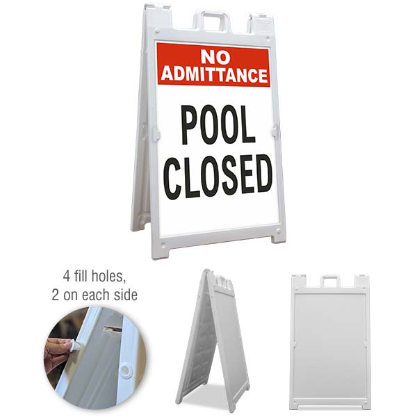 The No Admittance Pool Closed Sandwich Board has informational messages for property and swimming policy concerns. The No Admittance Pool Closed Sandwich Board is a useful tool to help protect the health and safety of others in pool and swimming areas, and is not a substitute for necessary protective measures for lessening or eliminating hazards.