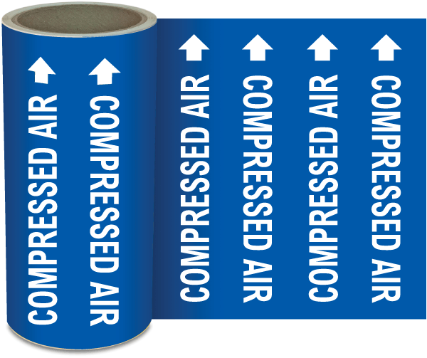 This Compressed Air Continuous Pipe Marker on a Roll uses informational messages for safety identification and compliance. A Compressed Air Continuous Pipe Marker on a Roll is a useful tool to help protect the health and safety of personnel, but is not a substitute for required protective measures for eliminating or reducing hazards.