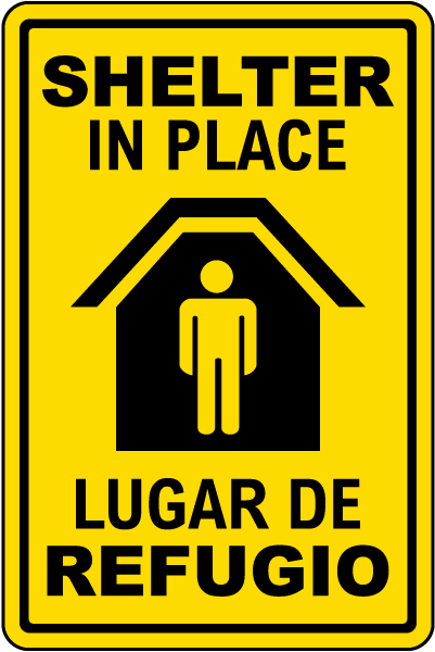 A Bilingual Shelter In Place Sign has safety messages for emergency response protocol and compliance. A Bilingual Shelter In Place Sign is a helpful resource to help protect the health and safety of personnel, and is not a substitute for required protective measures for reducing or eliminating hazards.