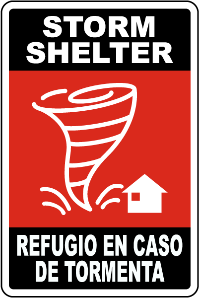 A Bilingual Storm Shelter Sign has safety messages for emergency response protocol and compliance. A Bilingual Storm Shelter Sign is a helpful resource to help protect the health and safety of personnel, and is not a substitute for required protective measures for reducing or eliminating hazards.