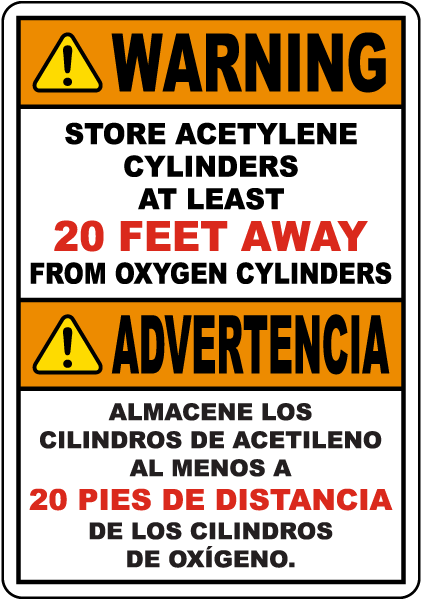 Warning Store Acetylene Cylinders At Least 20 Feet Away From Oxygen Cylinders ; Advertencia Almacene Los Cilindros De Acetileno Al Menos A 20 Pies De Distancia De Los Cilindros de Oxigeno.