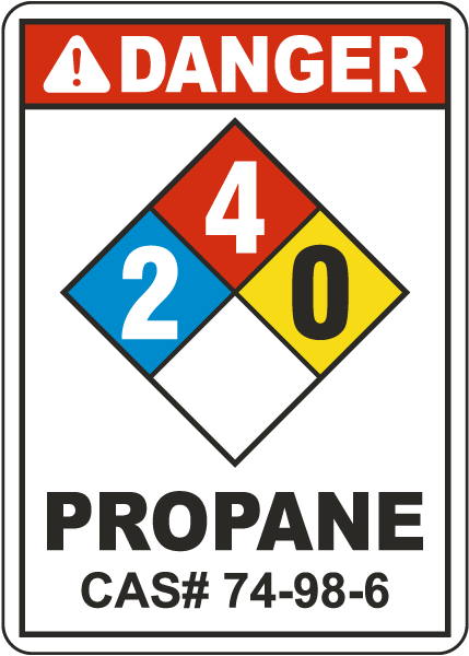 Use a NFPA Danger Propane 2-4-0 Sign to identify, raise awareness and promote safety practices where propane is used, handled, or stored. As an extremely flammable gas, it is important to take extra precautions when handling and storing propane. Sources of ignition such as sparks, open flames and smoking should be prohibited.