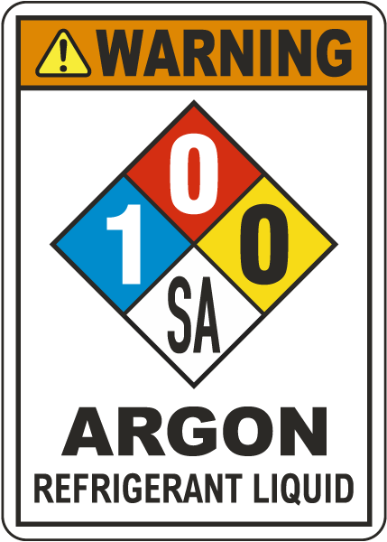 Use NFPA Warning Argon Refrigerant Liquid 1-0-0-SA Sign to identify, raise awareness and promote safety practices where argon gas is used, handled, or stored. Categorized as a simple asphyxiant, it is important to take extra precautions when handling and storing argon.