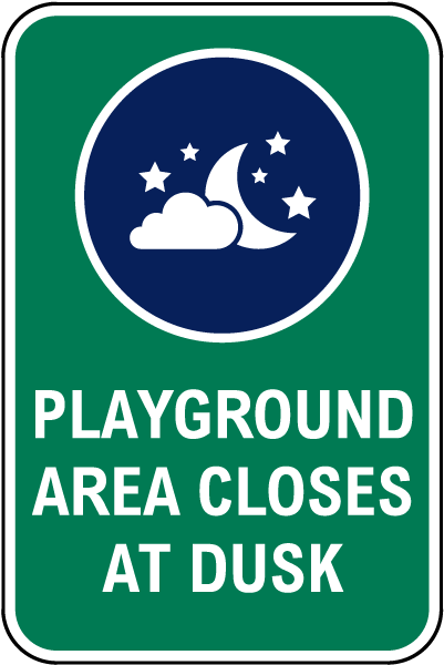 Use a properly displayed Playground Area Closes At Dusk Sign to remind parents and children of when the playground area closes. This sign is available in 2 sizes and can be manufactured in a variety of materials.
