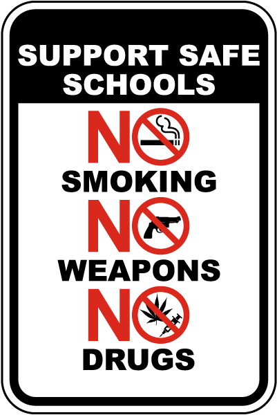 Post this sign to remind students, staff, and visitors that smoking, weapons, and drugs are prohibited on school property and encourage them to support safe schools in Idaho. This sign is available in a wide range of sizes and materials, making it ideal for use in any setting.