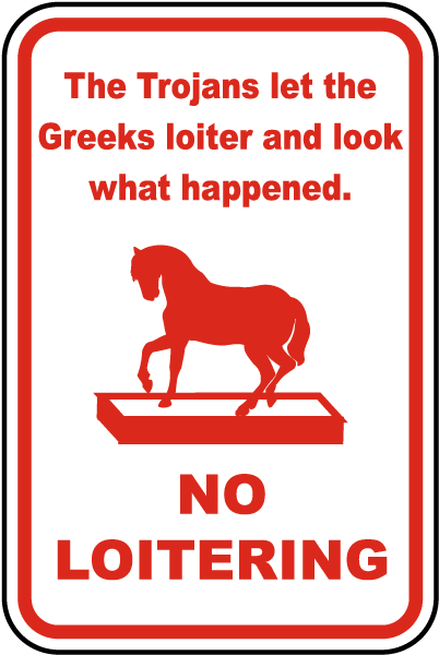 A No Loitering Trojan Horse Sign has compelling messages to address property policy and safety interests. A No Loitering Trojan Horse Sign is a useful tool to help protect the health and safety of staff, and is not a substitute for necessary protective measures for lessening or eliminating hazards.
