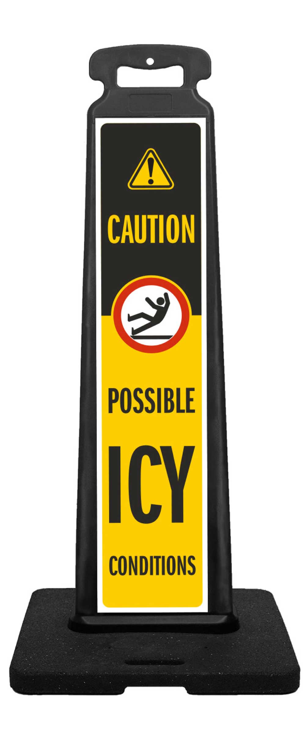 Our Possible Icy Conditions Vertical Panel is an essential safety tool for alerting drivers and pedestrians to the potential presence of icy conditions. Crafted with durable plastic and featuring a sturdy recycled rubber base, this panel ensures reliable performance in various weather conditions. With its clear "Possible Icy Conditions" message, it serves as a highly visible indicator, prompting individuals to exercise caution and be prepared for slippery surfaces. Whether used in parking lots, roadways, or other areas prone to icing, this panel helps raise awareness and encourages safe and responsible behavior.