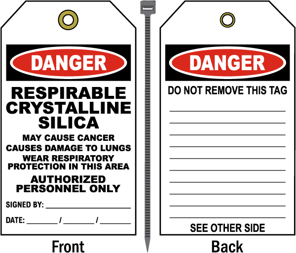 Front Side: Danger Respirable Crystalline Silica May Cause Cancer Causes Damage To Lungs Wear Respiratory Protection In This Area Authorized Personnel Only Signed By: ____ Date: __/__/__ Back Side: Danger Do Not Remove This Tag ___ See Other Side