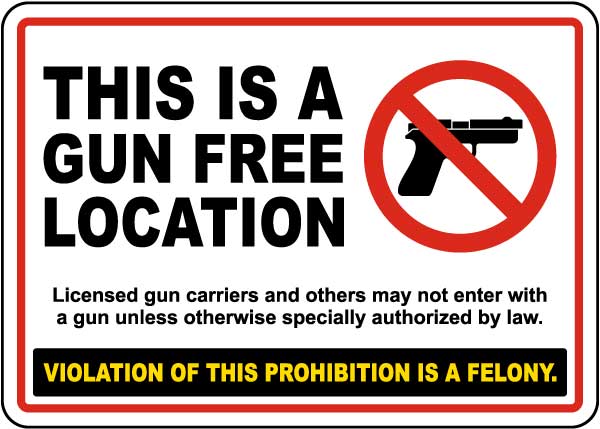 This Is a Gun Free Location Licensed Gun Carriers and Others May Not Enter with A Gun Unless Otherwise Specially Authorized by Law. Violation Of This Prohibition Is a Felony.