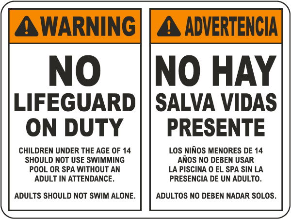 Warning No Lifeguard on Duty Children Under the Age of 14 Should Not Use Swimming Pool or Spa Without an Adult in Attendance. Adults Should Not Swim Alone. | Advertencia No Hay Salvavidas Presente Los Niños Menores de 14 Años No Deben Usar la Piscina o el Spa Sin la Presencia de un Adulto. Adultos No Deben Nadar Solos.