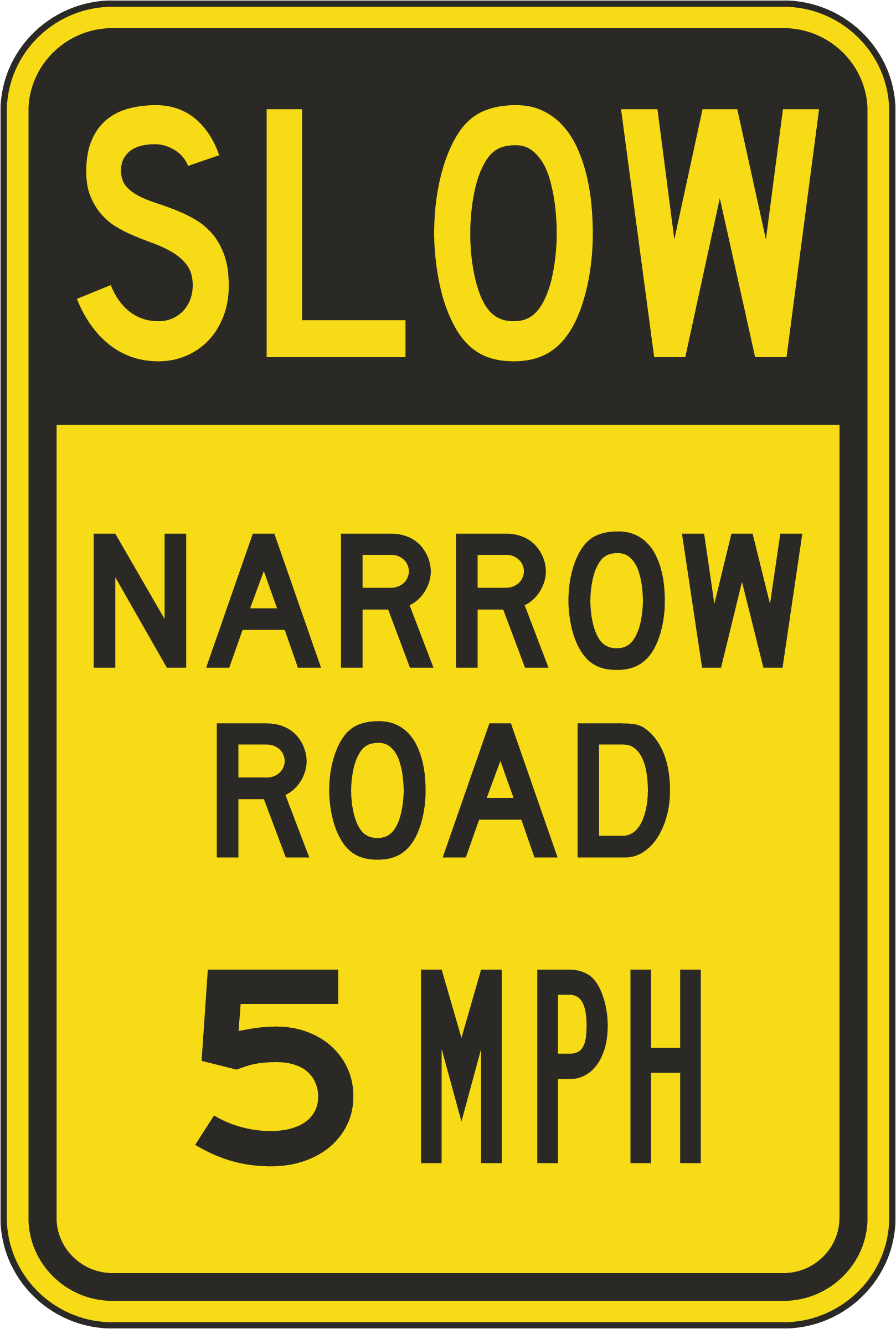 Our Slow Narrow Road 5 MPH Sign indicates a particularly tight space with speed restrictions, which can be navigated safely at 5 miles per hour. Made with durable materials, this sign is designed to last in all various weather conditions for long-term use.