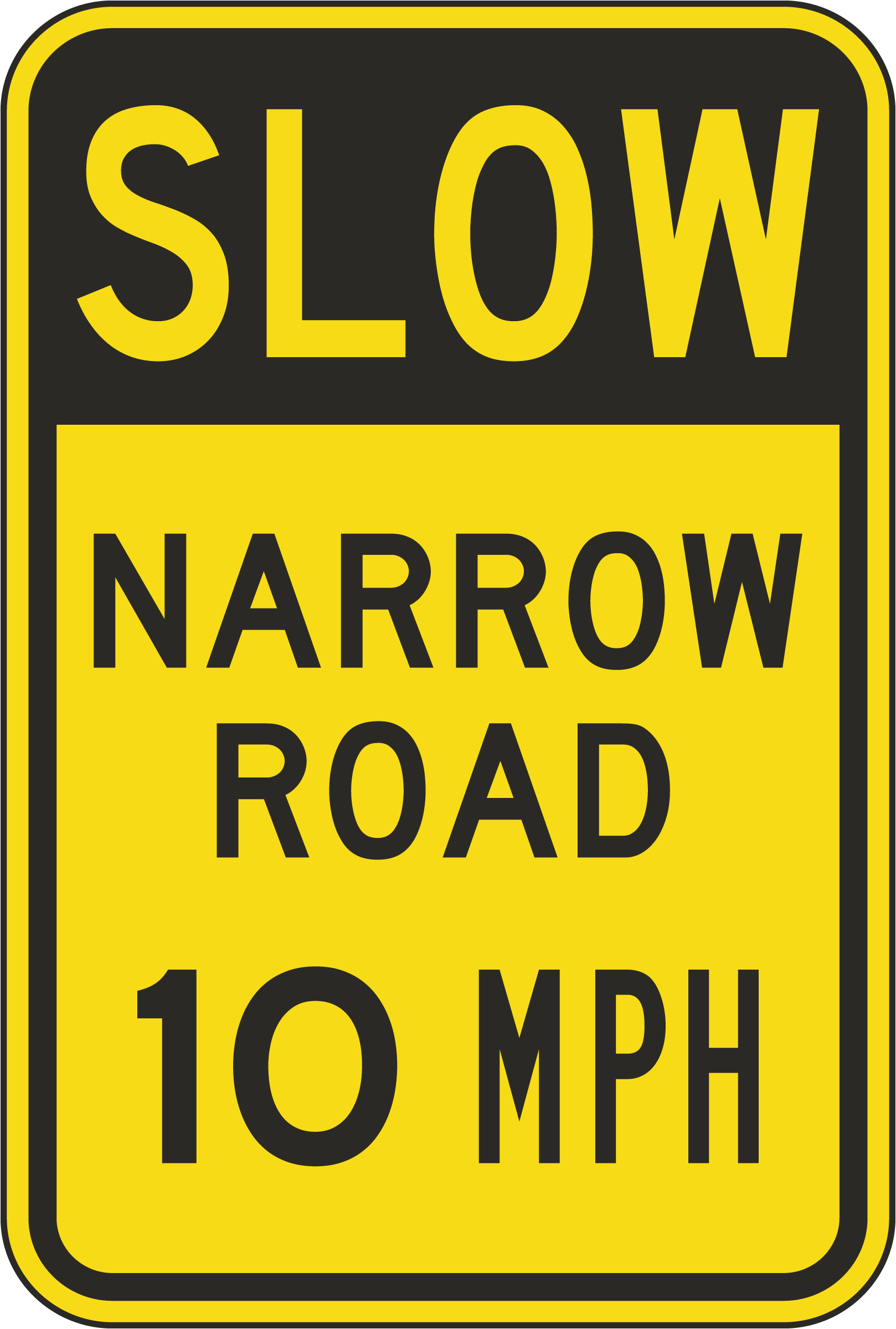 Our Slow Narrow Road 10 MPH Sign indicates a constricted roadway passage with speed restrictions to navigate safely at 10 miles per hour. Built from premium materials to withstand the elements, this sign is designed to promote roadway safety in narrow areas.