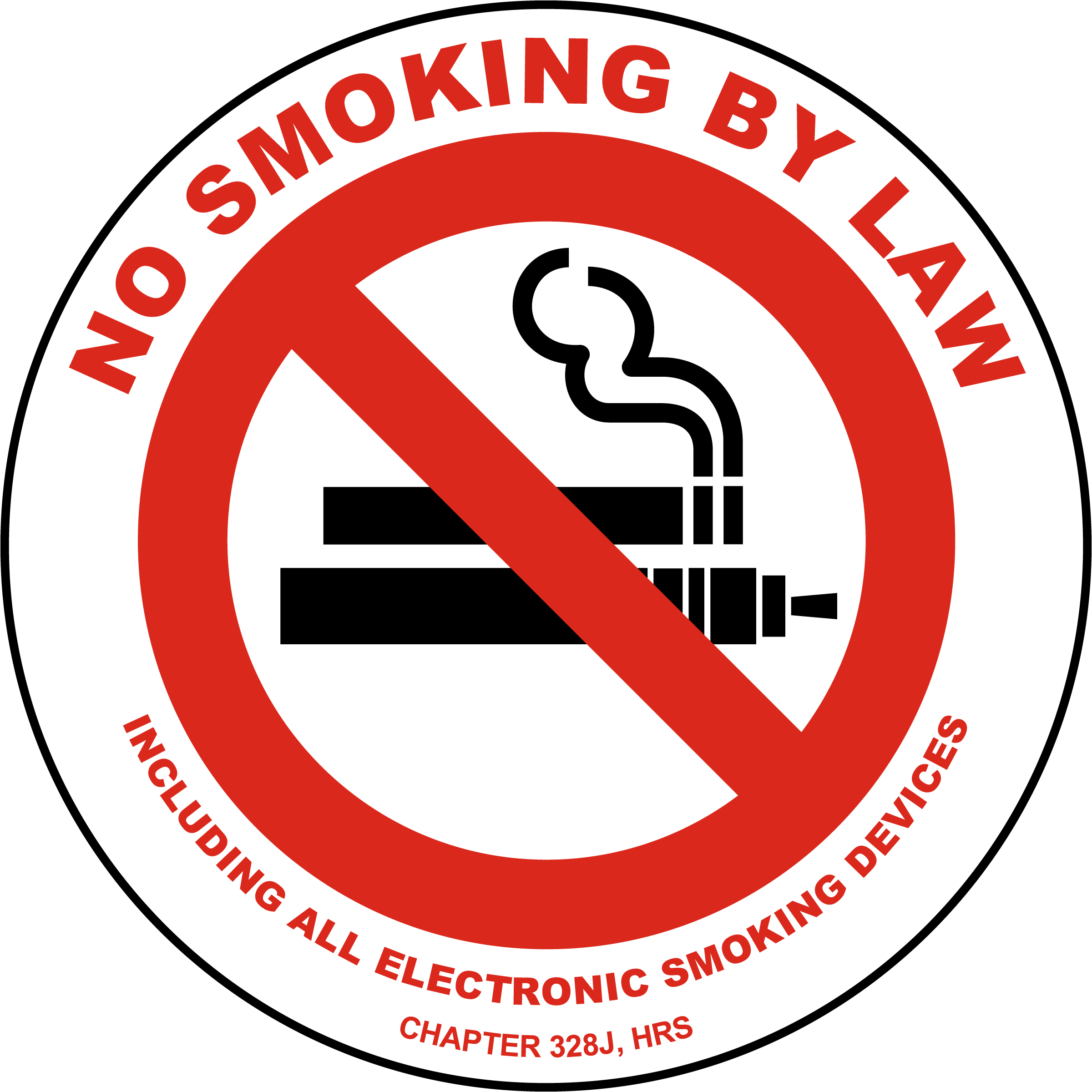 Restaurants, bars, and businesses must adhere to the law [§328J-9, HRS] by: posting a sign at each entrance. The signs must read “Smoking Prohibited by Law” with text at least one inch in height. The Department of Health (DOH) strongly recommends including the phrase “including e-cigarettes and all other electronic smoking devices” and featuring the “No Smoking” symbol with a pictorial representation of an e-cigarette.