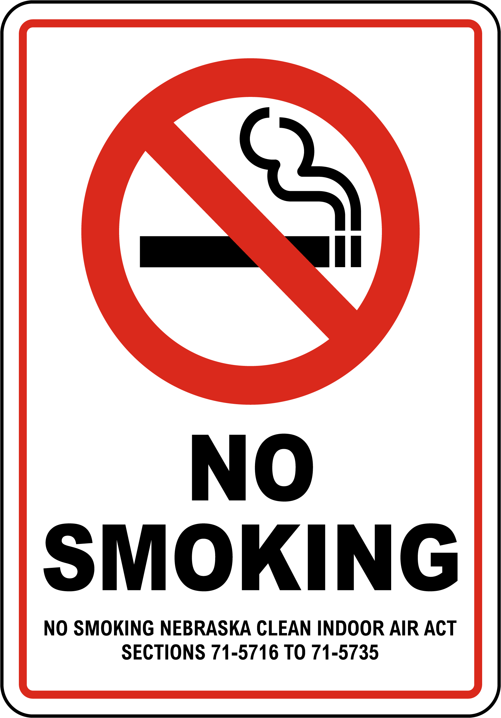 Our Nebraska No Smoking Sign serves as a clear directive that smoking is not allowed in the area. Made from durable materials, this sign complies with the Nebraska Clean Indoor Air Act Sections 71-5716 to 71-5735, ensuring everyone understands the no-smoking policy.