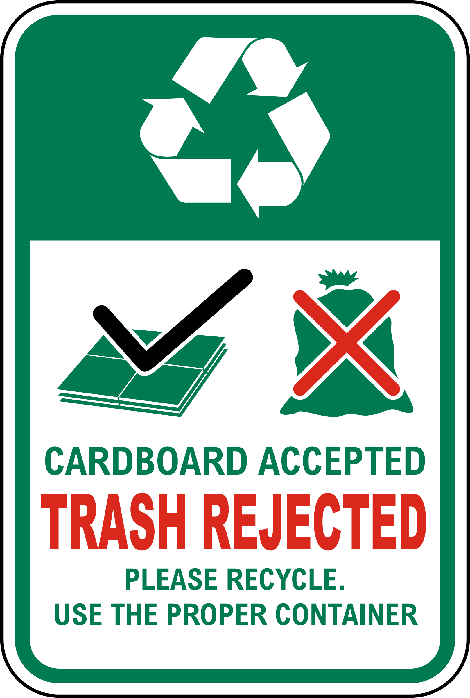 Our Cardboard Accepted Trash Rejected Recycle Sign is a clear marker for areas accepting only cardboard, helping reduce contamination in waste streams. Constructed from durable materials, this sign provides clear, long-lasting guidance for effective recycling practices.