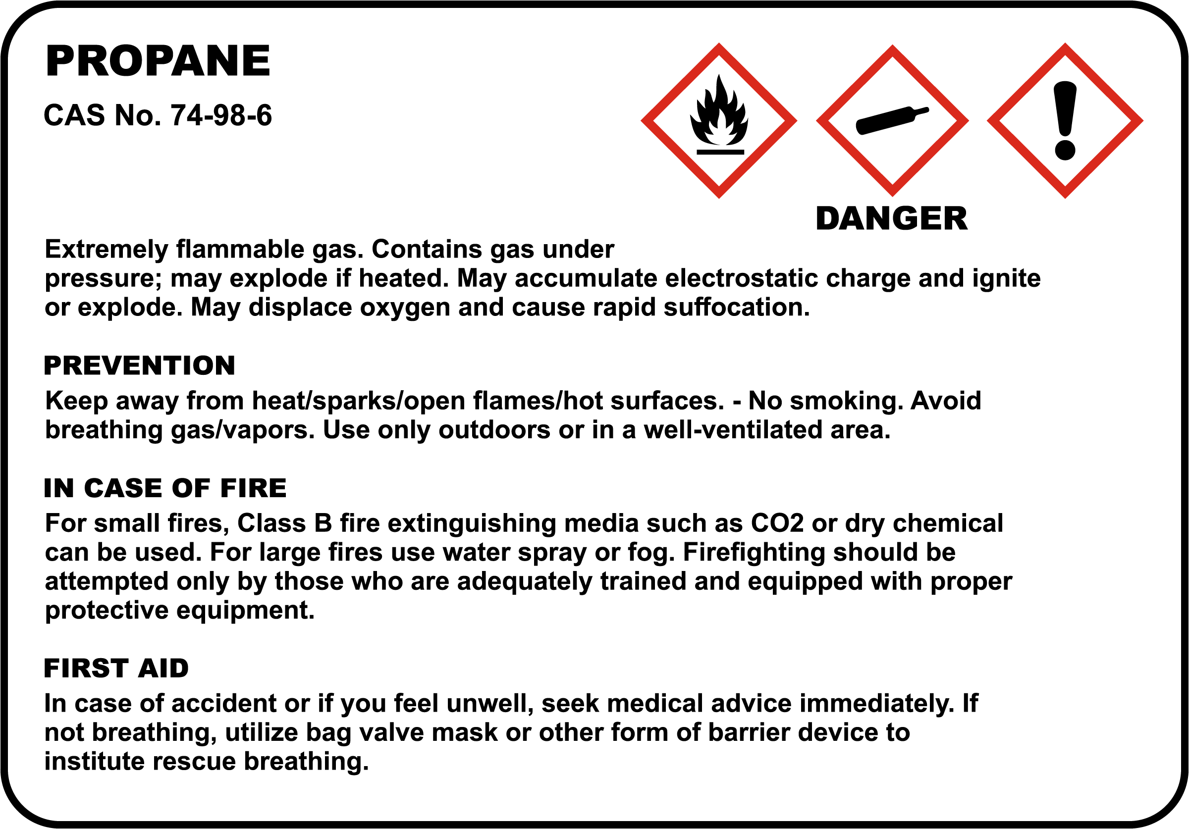 Propane CAS No. 74-98-6 Danger Extremely Flammable Gas. Contains Gas Under Pressure; May Explode If Heated. May Accumulate Electrostatic Charge And Ignite Or Explode. May Displace Oxygen And Cause Rapid Suffocation. Prevention Keep Away From Heat/Sparks/Open Flames/Hot Surfaces. - No Smoking. Avoid Breathing Gas/Vapors. Use Only Outdoors Or In A Well-Ventilated Area. In Case Of Fire For Small Fires, Class B Fire Extinguishing Media Such As CO2 Or Dry Chemical Can Be Used. For Large Fires Use Water Spray Or Fog. Firefighting Should Be Attempted Only By Those Who Are Adequately Trained And Equipped With Proper Protective Equipment. First Aid In Case Of Accident Or If You Feel Unwell, Seek Medical Advice Immediately. If Not Breathing, Utilize Bag Valve Mask Or Other Form Of Barrier Device To Institute Rescue Breathing.