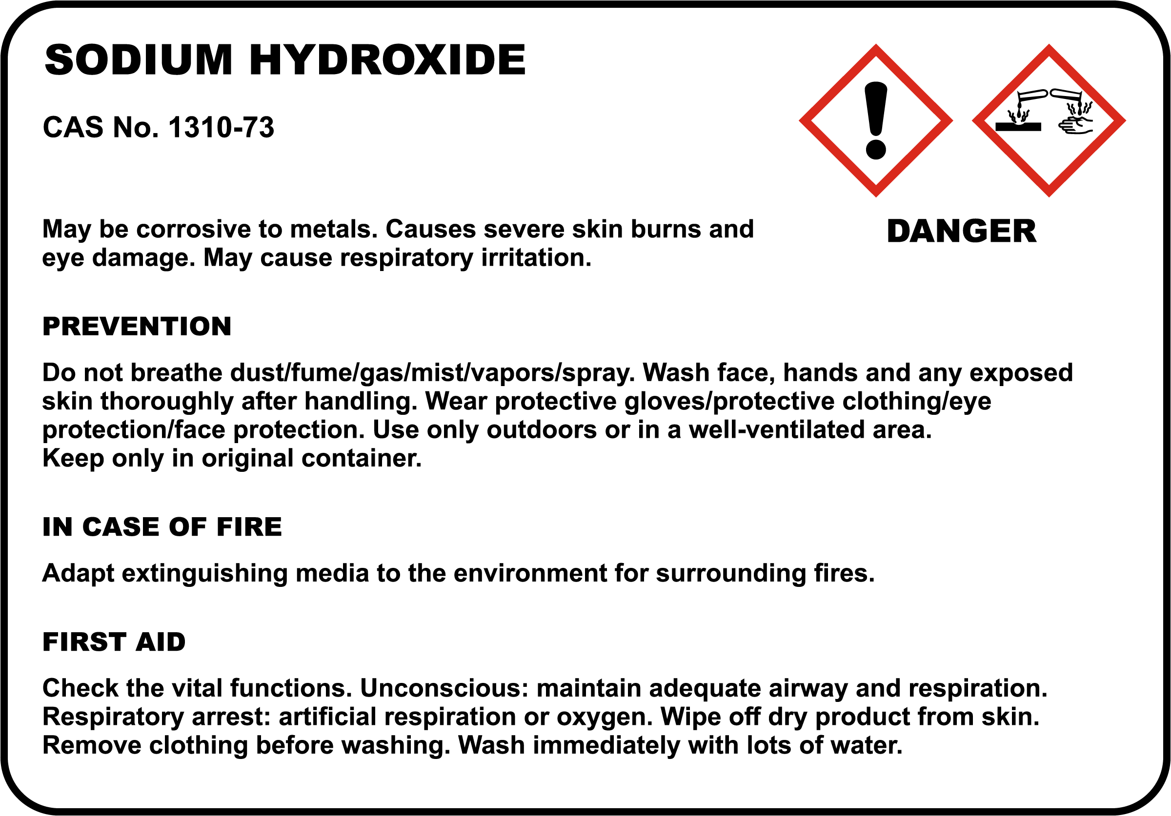 Sodium Hydroxide CAS No. 1310-73 Danger May Be Corrosive To Metals. Causes Severe Skin Burns And Eye Damage. May Cause Respiratory Irritation. Prevention Do Not Breathe Dust/Fume/Gas/Mist/Vapors/Spray. Wash Face, Hands And Any Exposed Skin Thoroughly After Handling. Wear Protective Gloves/Protective Clothing/Eye Protection/Face Protection. Use Only Outdoors Or In A Well-Ventilated Area. Keep Only In Original Container. In Case Of Fire Adapt Extinguishing Media To The Environment For Surrounding Fires. First Aid Check The Vital Functions. Unconscious: Maintain Adequate Airway And Respiration. Respiratory Arrest: Artificial Respiration Or Oxygen. Wipe Off Dry Product From Skin. Remove Clothing Before Washing. Wash Immediately With Lots Of Water.