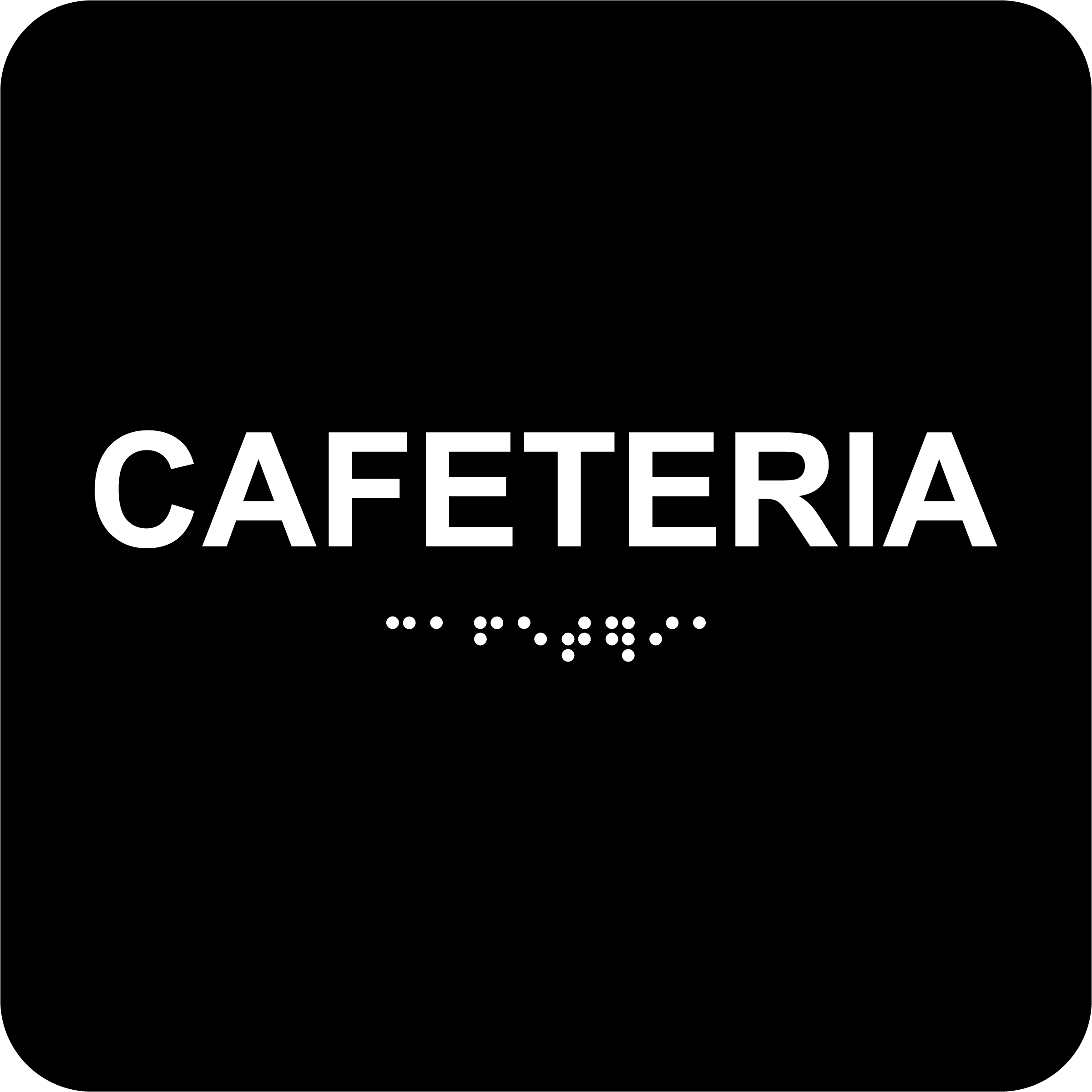 This Cafeteria Sign with Braille helps clearly identify dining areas in workplaces, schools, and commercial spaces. Featuring a black background, it includes raised text and ADA-compliant Braille for enhanced accessibility. The adhesive backing ensures quick installation.