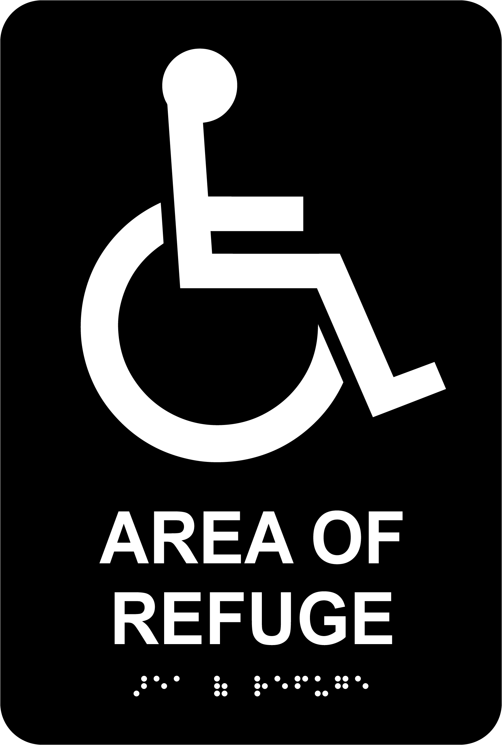 The Area of Refuge Sign with Braille is designed to identify locations where individuals can wait safely in case of an emergency. Featuring a black background, this sign meets ADA accessibility standards with both raised text and Braille.