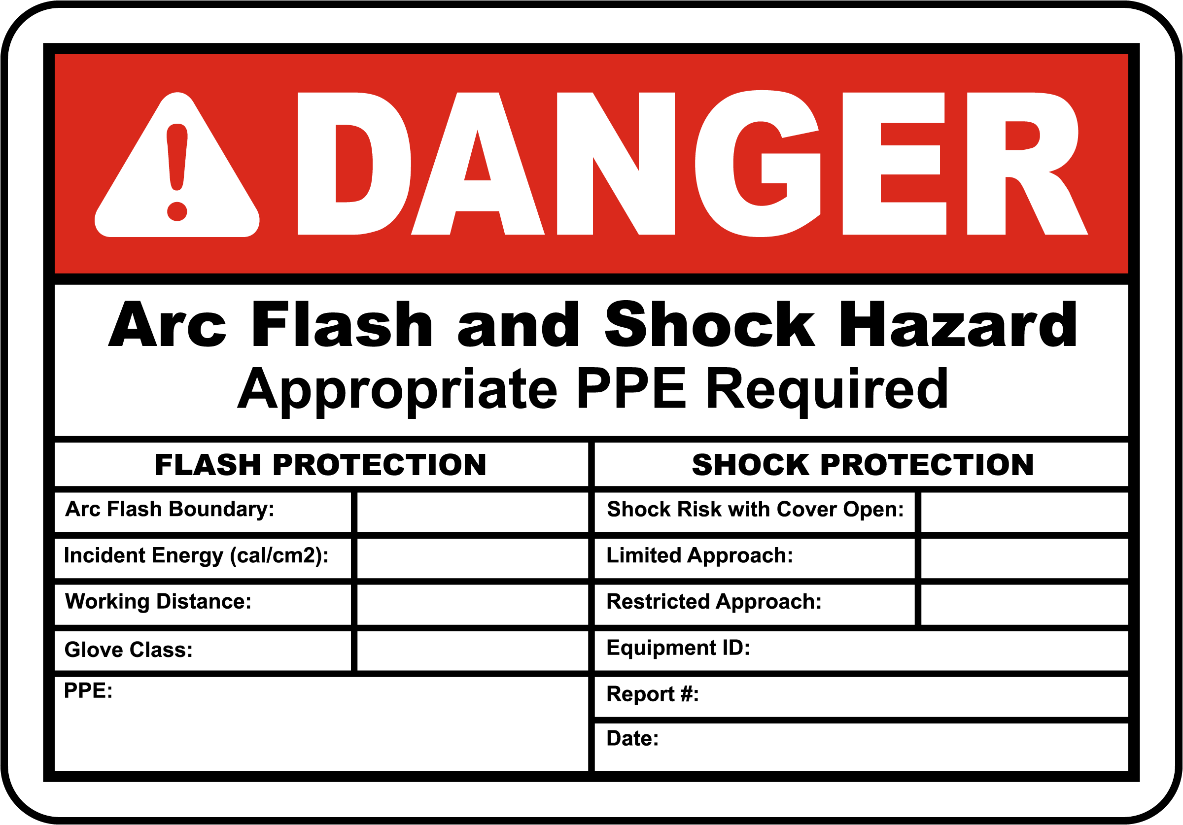 DANGER Arc Flash and Shock Hazard Appriopriate PPE Required FLASH PROTECTION Arc Flash Boundary: Incident Energy (cal/cm2): Working Distance: Glove Class: PPE: SHOCK PROTECTION Shock Risk with Cover Open: Limited Approach: Restricted Approach: Equipment ID: Report #: Date: