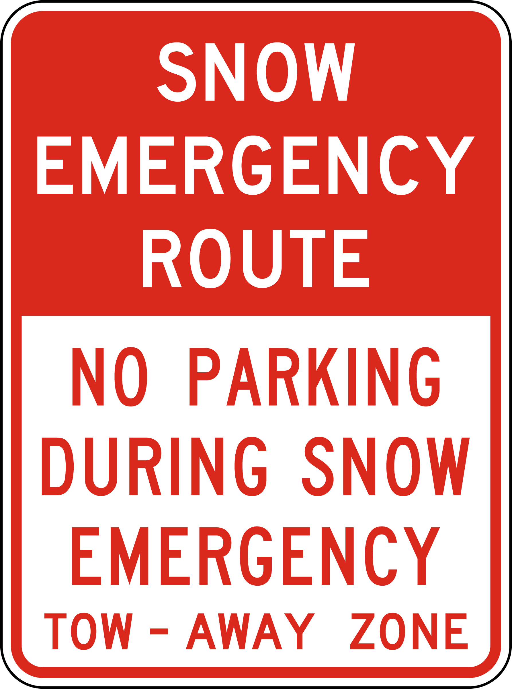 This Snow Emergency Route Sign designates roads that must remain clear for emergency vehicles and snowplows during severe weather conditions. The highly visible design ensures drivers understand parking and driving restrictions in winter months. It is essential for municipalities, highways, and major roadways prone to heavy snowfall.