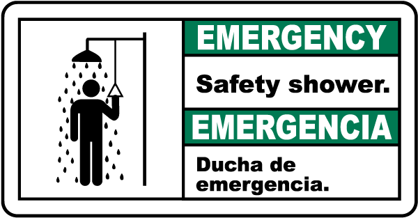 A Bilingual Emergency Safety Shower Sign has official ANSI headers for safety protocol and compliance. A Bilingual Emergency Safety Shower Sign is a helpful resource to help protect the health and safety of personnel, and is not a substitute for required protective measures for reducing or eliminating hazards.