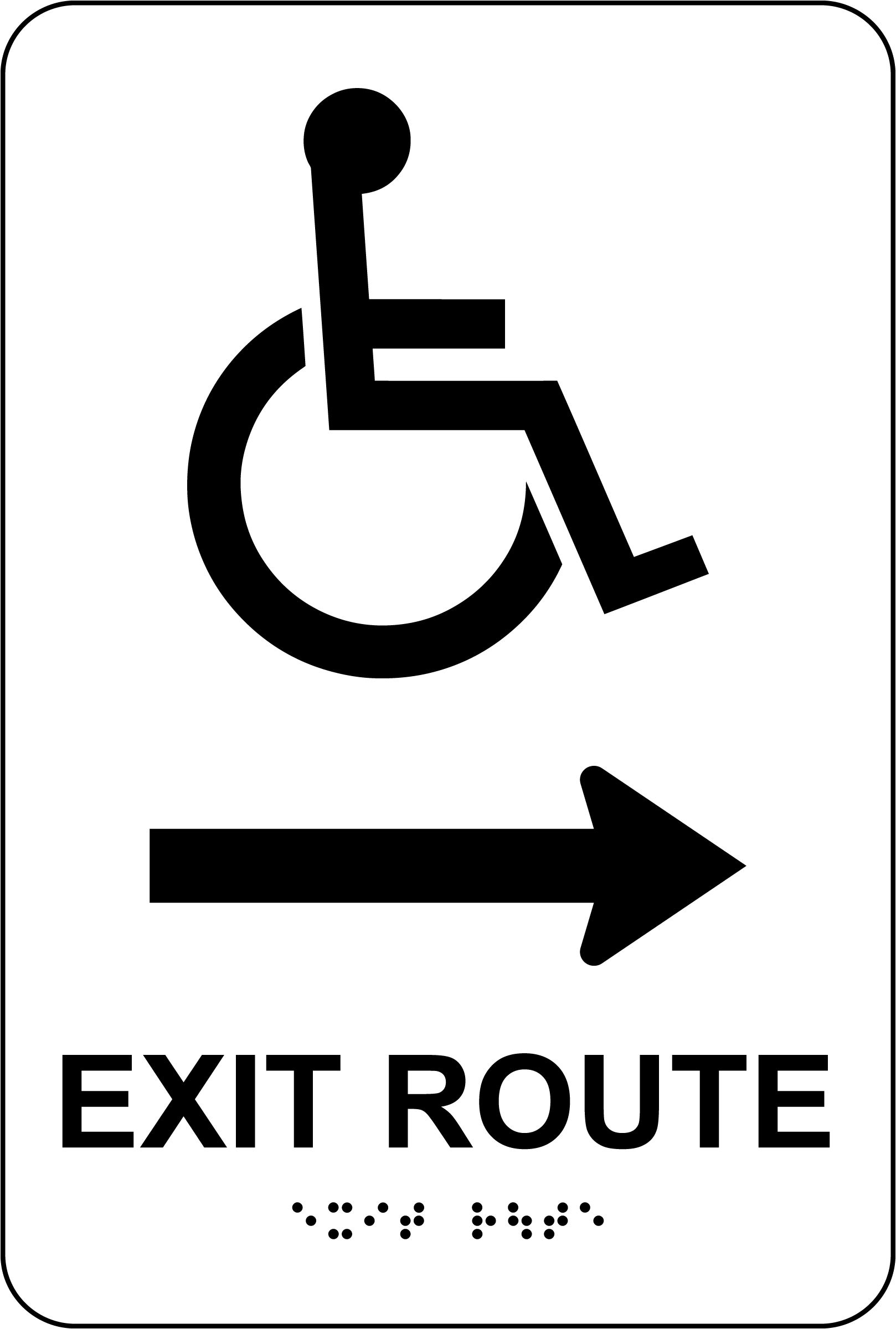 This Exit Route To The Right Sign with Braille provides clear directional guidance during emergencies, with a black background for enhanced visibility. The raised text and Braille ensure it is ADA-compliant for those with visual impairments.