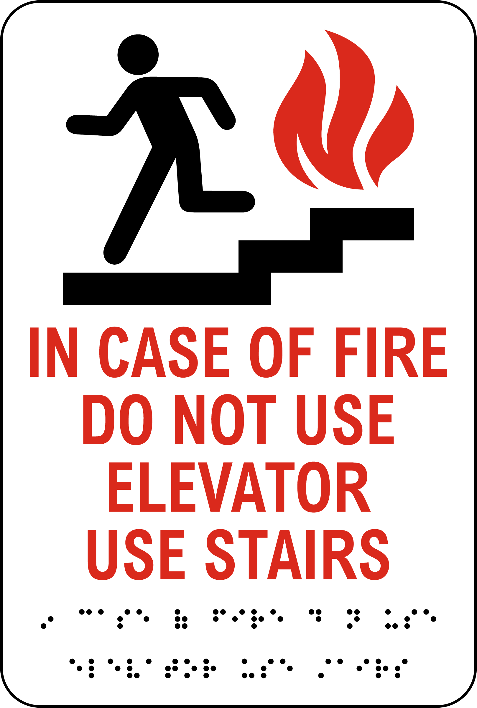 The In Case of Fire Use Stairs Sign with Braille reminds individuals to use stairs instead of elevators in emergencies. With a black background, raised text, and Braille, this sign enhances visibility and ensures compliance with ADA fire safety standards.