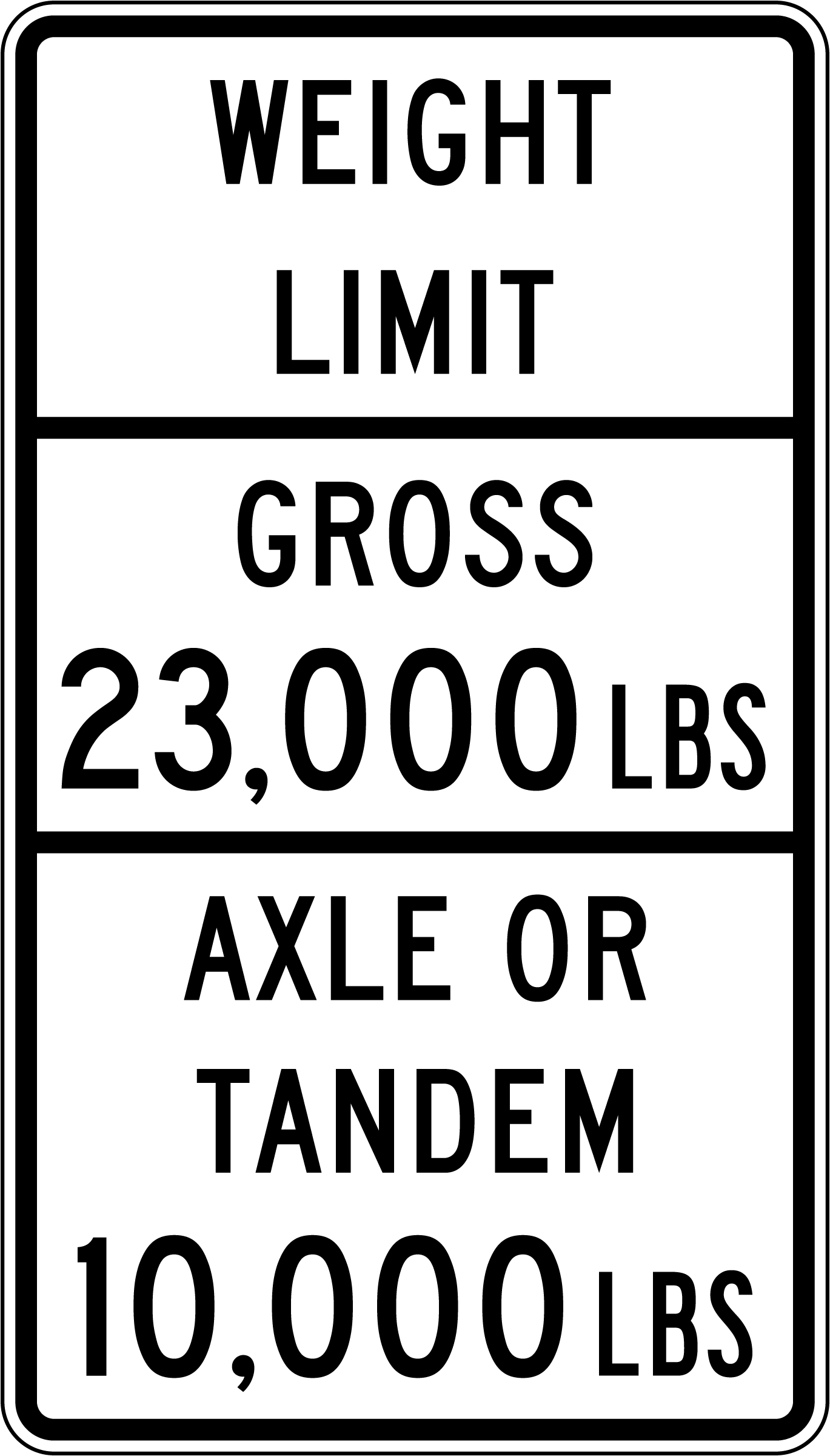 Our Texas Weight Limit Gross, Axle or Tandem Sign consolidates gross, single-axle, and tandem-axle restrictions on one panel. It simplifies roadside communication for drivers and enforcement. Long-life design ensures reliable service in demanding settings.