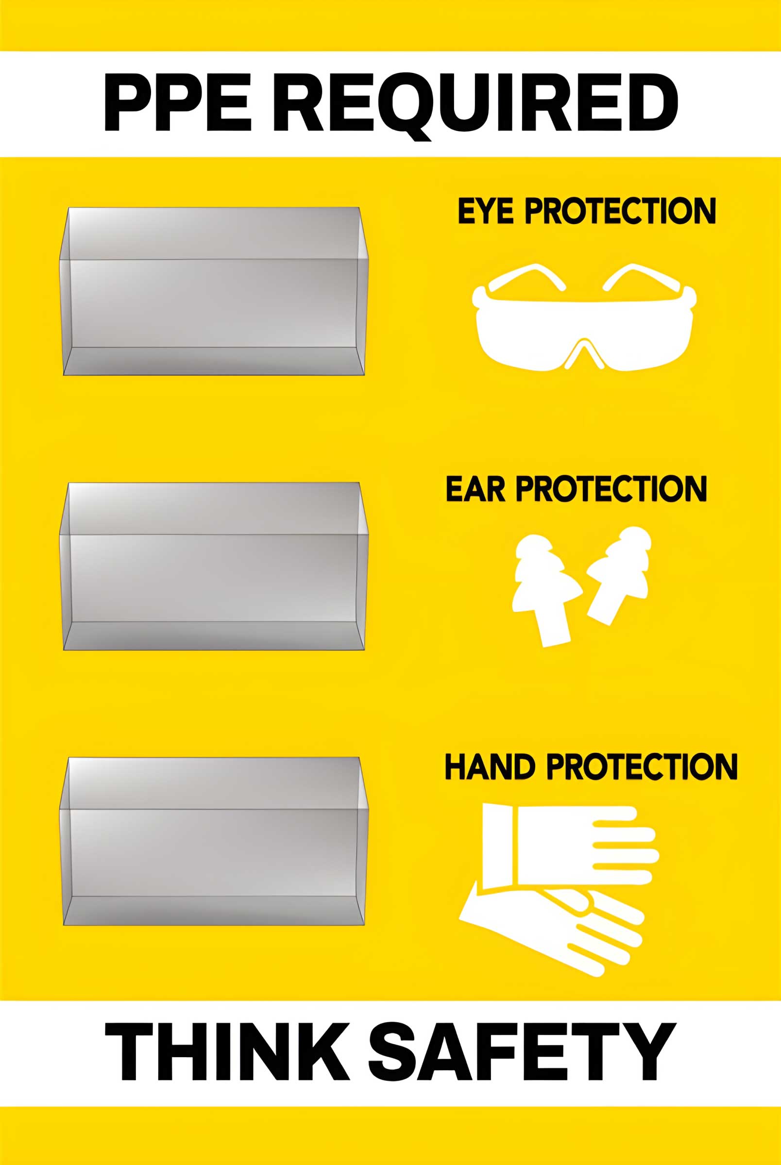 PPE Required, Eye Protection, Ear Protection, Hand Protection, Think Safety