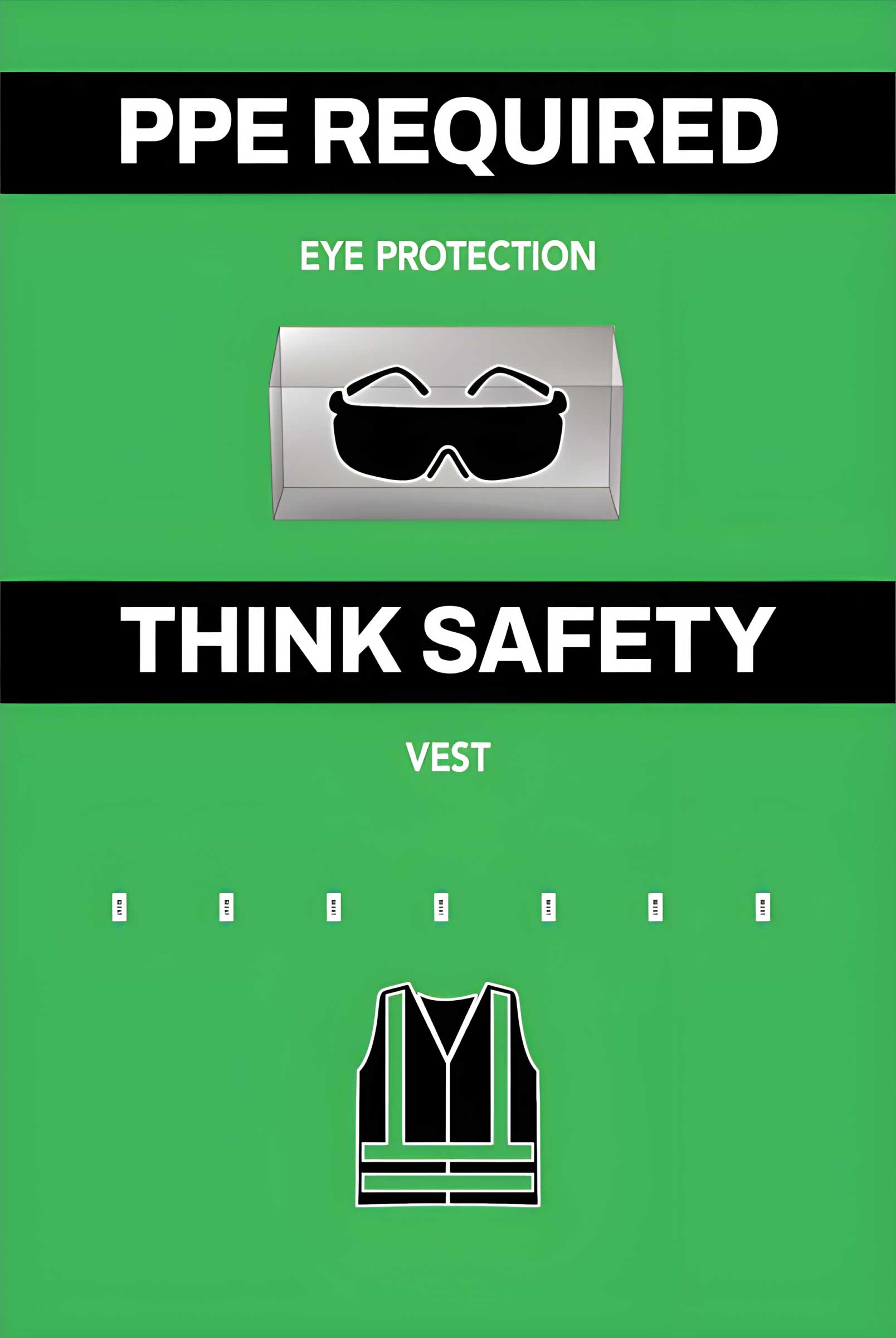 - Improve Safety Compliance – Makes required PPE visible and accessible, ensuring workers know exactly what protection is needed before entering the area.