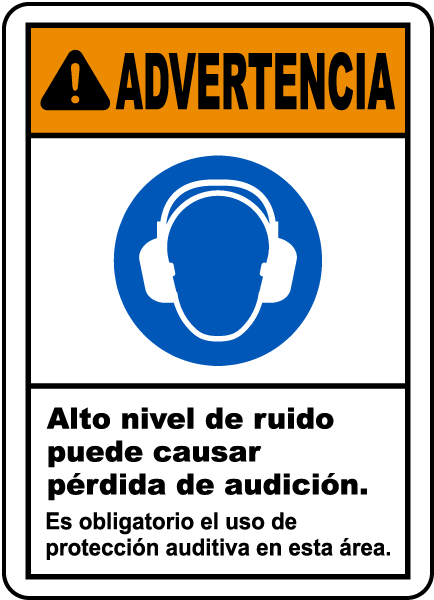 A Spanish Warning Hearing Protection Required Sign has official ANSI headers for safety protocol and compliance. A Spanish Warning Hearing Protection Required Sign is a useful tool to help protect the health and safety of staff, and is not a substitute for necessary protective measures for lessening or eliminating hazards.