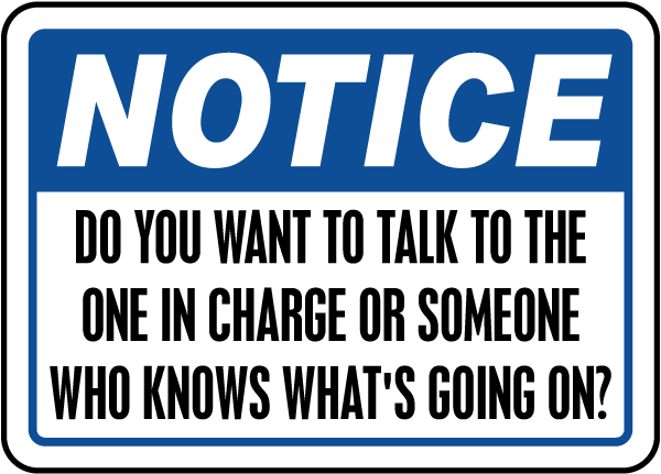 This Talk To Someone In Charge Sign is a great way to add some fun to your workplace or at home. Printed on the same materials as our official safety signs, your Talk To Someone In Charge Sign will provide laughs for years in the office, home, or as a gift.