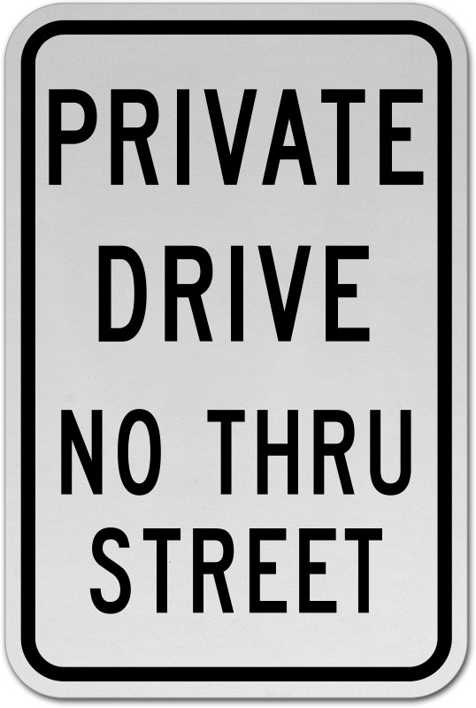 This Private Drive No Thru Street Sign uses effective messages or images for traffic and pedestrian safety concerns. A Private Drive No Thru Street Sign is a useful device to help protect the health and safety on roadways, but is not an alternative for required protective measures for eliminating or abating hazards.