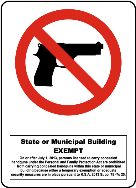 State Or Municipal Building Exempt On Or After July 1, 2013, Persons Licensed To Carry Concealed Handguns Under The Personal And Family Protection Act Are Prohibited From Carrying Concealed Handguns Within This State Or Municipal Building Because Either A Temporary Exemption Or Adequate Security Measures Are In Place Pursuant To K.S.A. 2013 Supp. 75 -7C 20.