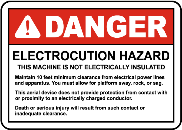 Danger Electrocution Hazard This Machine Is Not Electrically Insulated Maintain 10 Feet Minimum Clearance From Electrical Power Lines And Apparatus. You Must Allow For Platform Sway, Rock, Or Sag. This Aerial Device Does Not Provide Protection From Contact With Or Proximity To An Electrically Charged Conductor. Death Or Serious Injury Will Result From Such Contact Or Inadequate Clearance.