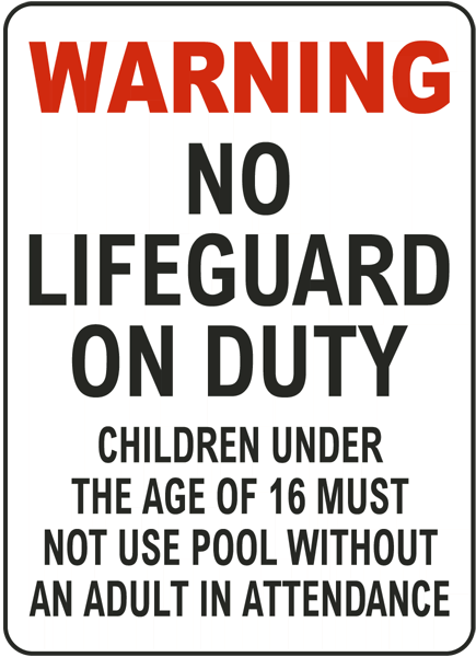 2-007.02A At Class B, C, D, E, and F swimming pools, where lifeguard service is not continuously provided, a warning sign must be placed in plain view of the user and must state: "WARNING -- NO LIFEGUARD ON DUTY" in letters at least four inches high, and "CHILDREN UNDER THE AGE OF 16 MUST NOT USE POOL WITHOUT AN ADULT IN ATTENDANCE" in letters at least two inches high.