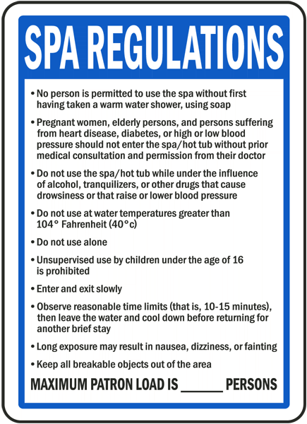 2-007.02C Spa regulations must be conspicuously posted in the spa area. Signs must have the title "Spa Regulations" in letters at least four inches high and must list the following regulations: